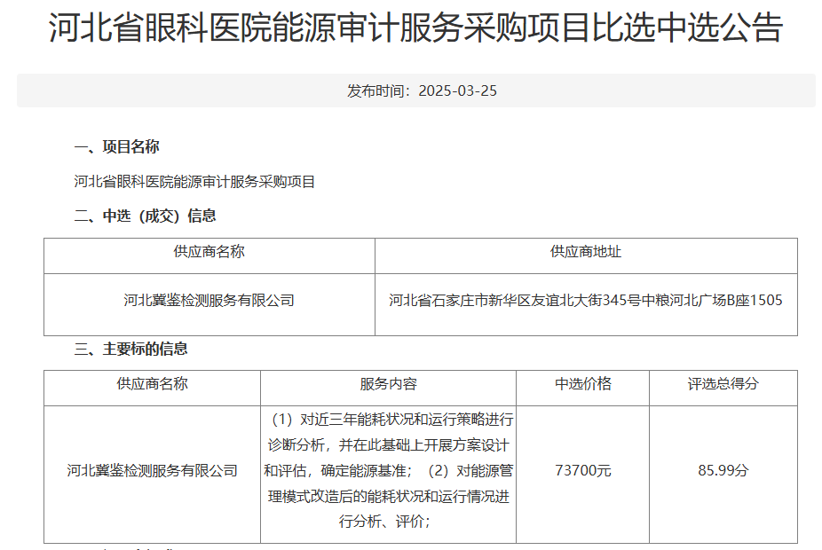 中標喜報憑借良好的信譽、行業(yè)經驗、堅實的技術能力及優(yōu)秀的方案,我公司最終順利中標“河北省眼科醫(yī)院能源審計服務采購項目”。 風起云涌新時代,破浪前行正當時。河北冀鑒檢測服務有限公司將緊抓機遇,迎接挑戰(zhàn),不斷提升審計服務水平。查看詳情>>